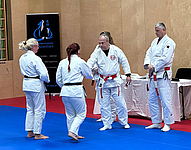 Sechs zum Teil sehr hoch graduierte Prüferinnen und Prüfer reisten an, um die Leistungen der Sportlerinnen zu beurteilen. Auch unser Trainer Remko war Teil einer Prüfungskommission – selbstverständlich ohne an der Bewertung seiner eigenen Vereinskollegin mitzuwirken.
